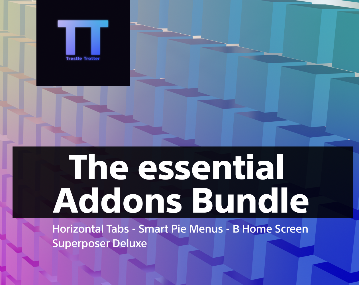 Horizontal Tabs gives heavy addon workflows a cleaner home. Smart Pie Menus turns repeated actions into context-aware tools. Peek a Node keeps sprawling node setups editable without diving in and out of node trees. Superposer keeps your reference material inside Blender instead of around it.